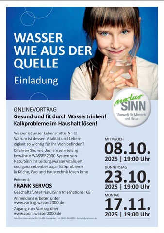Erfahren Sie in einem Online-Vortrag, wie das jahrzehntelang bewährte WASSER2000 - System von NaturSinn Ihr Leitungswasser vitalisiert und ganz nebenbei sogar Kalkprobleme in Küche, Bad und Haustechnik lösen kann.